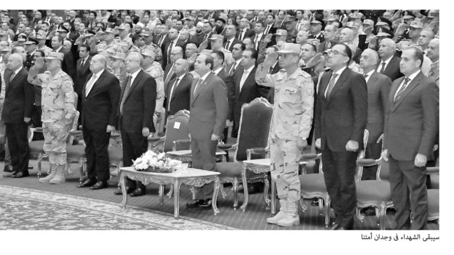 وقال الرئيس، إن حرب 67 و73 وحتى الحرب الأخيرة اللى قعدنا فيها 10 سنين «محاربة الإرهاب» اللى هى كنا بنجابه فيها فكرًا منحرفًا متطرفًا استباح دمنا ومستقبلنا، أنه يخرب بلدنا زى ما دول كتير اتخربت وزى ما دول كتير راحت وكان متصور إنه ممكن يعمل كده، وبرضه بإخلاص ودماء أبنائنا سواء اللى استُشِهدوا أو اللى أصيبوا، بكرر الكلام ده كتير علشان نبقى دايمًا فاكرين ومننساش إنه فيه تمن اتدفع فى البلد دى علشان تستمر وعلشان تبقى آمنة، واللى اتعمل فى رقابتنا كلنا والحفاظ عليها، والعمل على أنها تتطور وتطلع لقدام، ده ضريبة لازم ندفعها كلنا.