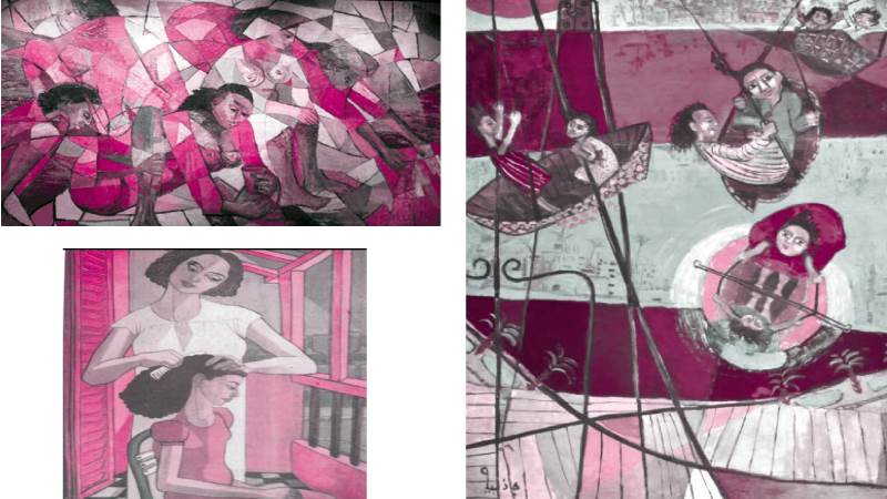 تعود الفنانة بعد ذلك  وبشكل متسارع للمزاوجة  فى تصوير الصحراء والبيوت والتلاحم البشرى مع الجدران لتشكل بها حوارًا راقيًا بين العضوية التشخيصية والتجريد الهندسى .. لتستمر فى حلقة  ثرية فى تصفية كل المشاعر وضمها ليظهر البشر بأشكال البيوت  وإذابتهم مع الصحراء فى نموذج فريد يشى بشخصيتها الفنية الفريدة والغزيرة فى الموهبة .