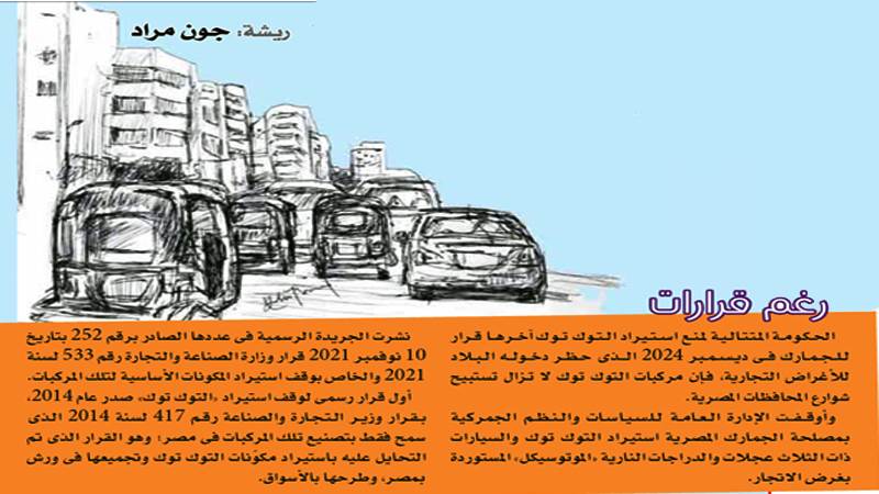 لكن غياب مواد واضحة فى قانون المرور تُنظّم عمل «التوك توك» بشكل شامل، جعل قرارات الترخيص أشبه بالحلول المؤقتة أو الصعبة.